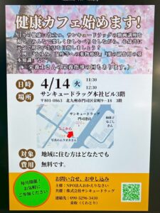 突然見慣れない投稿になりますが、ご容赦ください。 2026年4月14日(火)に、株式会社サンキュードラッグさんとの共催で、地域住民交流企画「健康カフェ」事業をス...