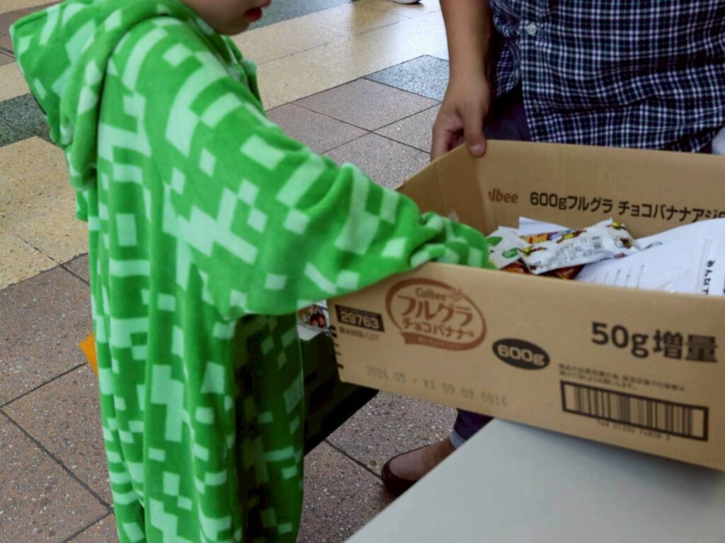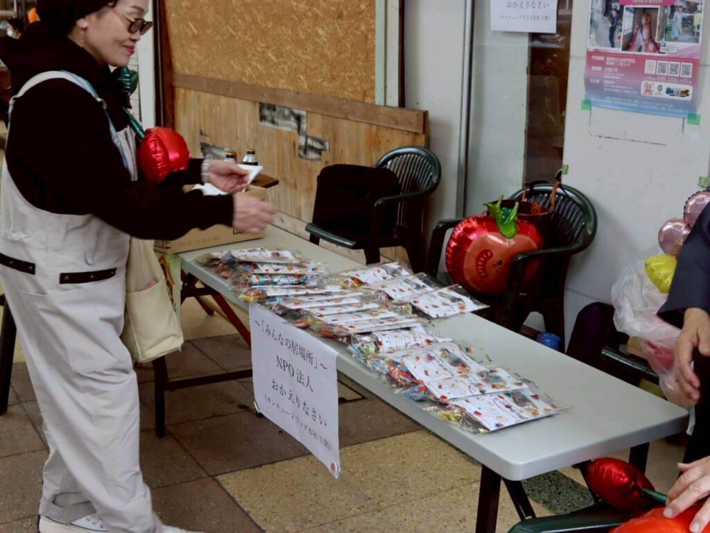 10月25日(土)の12:00から、栄町銀天街のアーケード内でハロウィンのお菓子と『みんなの居場所』の案内チラシを配りました。