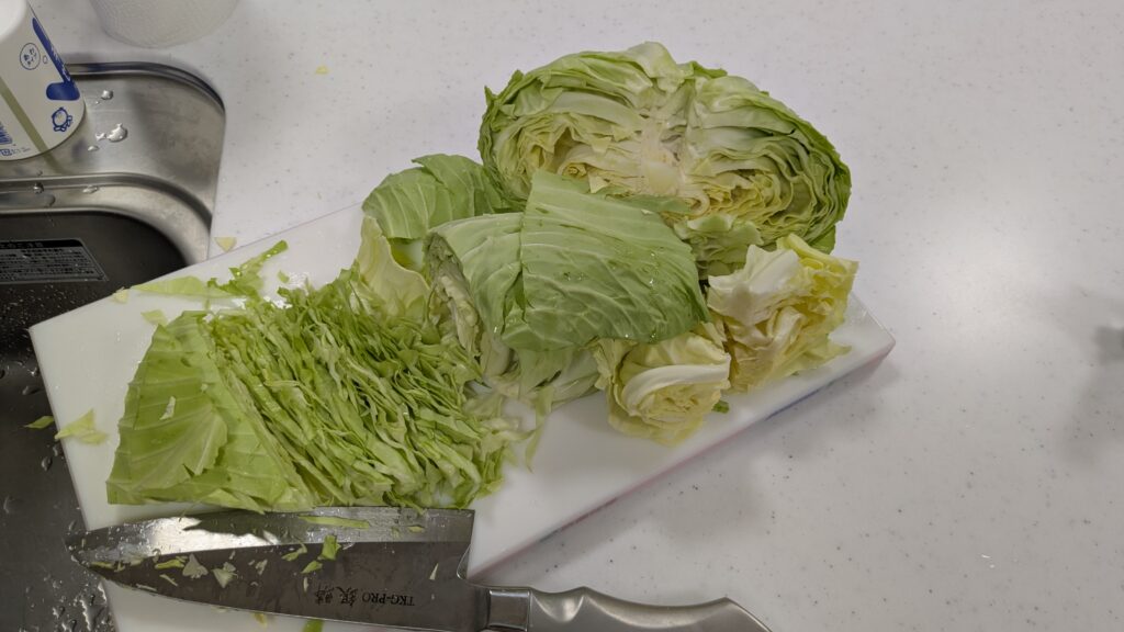 Iさんに急遽ボランティアをお願いして、私は人生で初めてキャベツを切る覚悟をします。