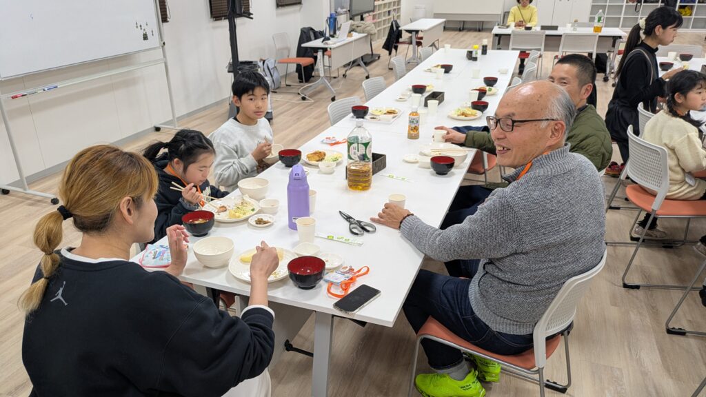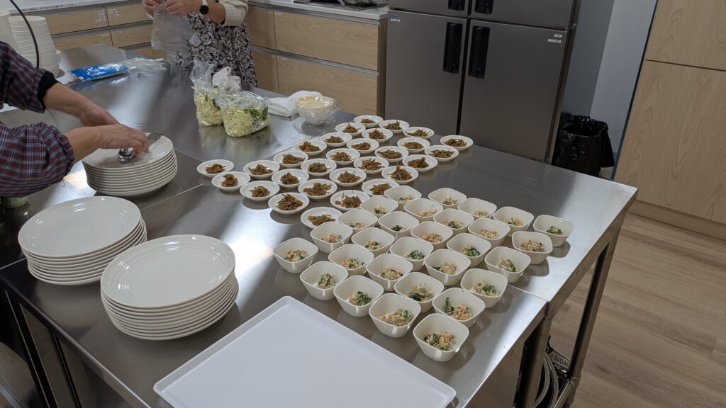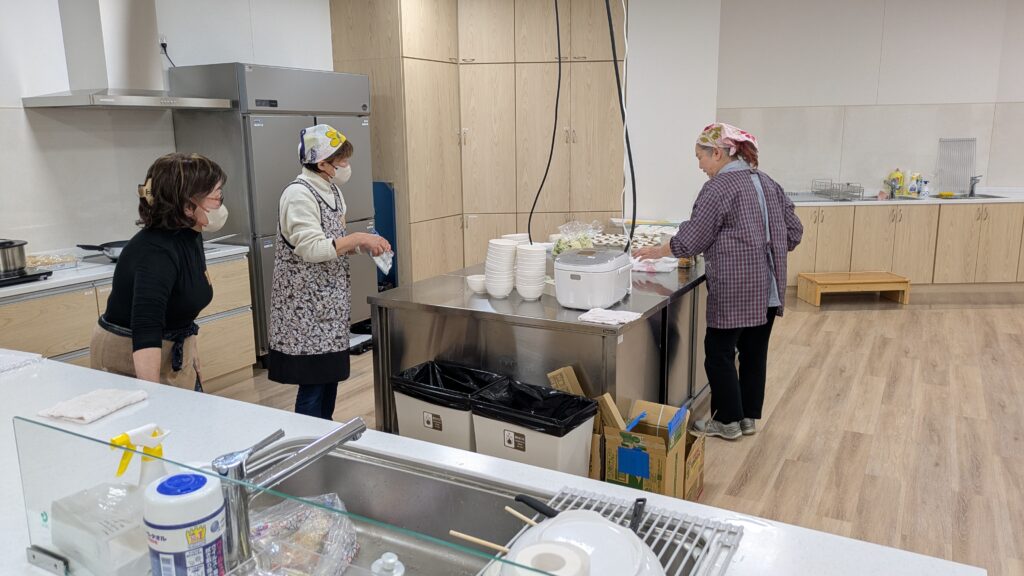 かざぐるまの女将さんも開店前に調理に来て下さって、結果として、プロボノの女将さん、おかえりなさい「食事・団らんグループ」の京子さん、参加者のおばあちゃん、全くの外部からボランティアで来て下さった女性、と立場の違う方々が集まって下さったことです。