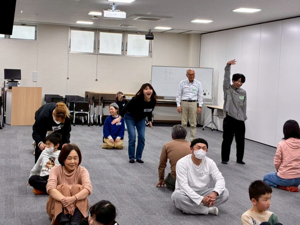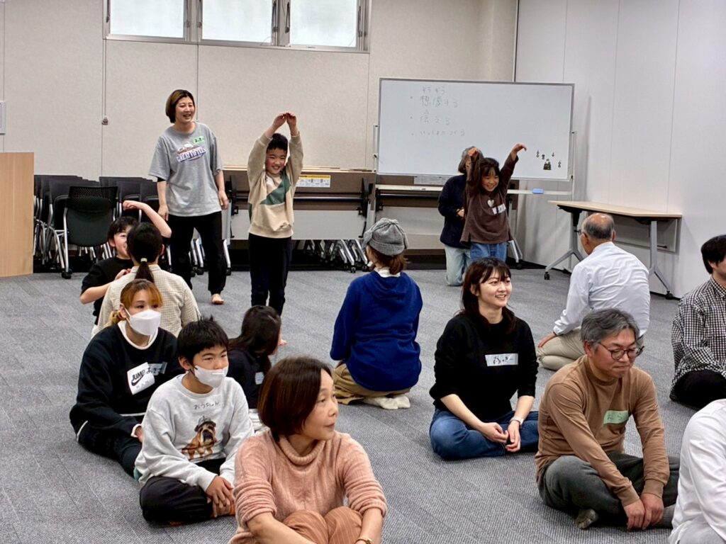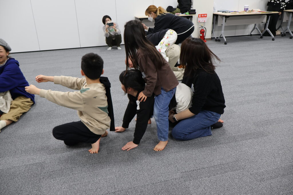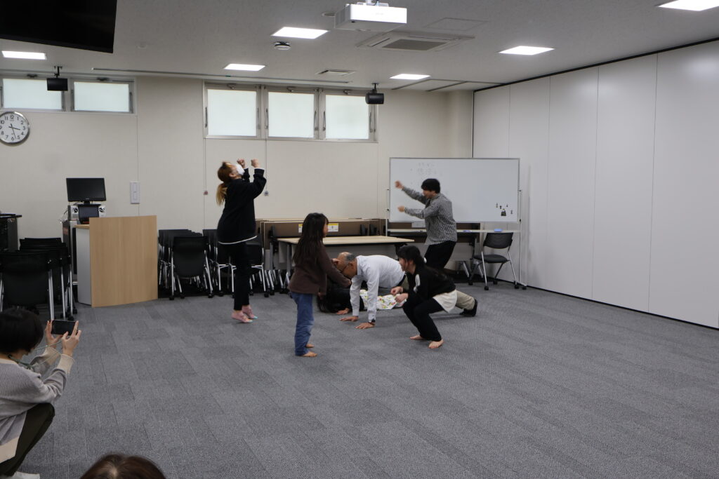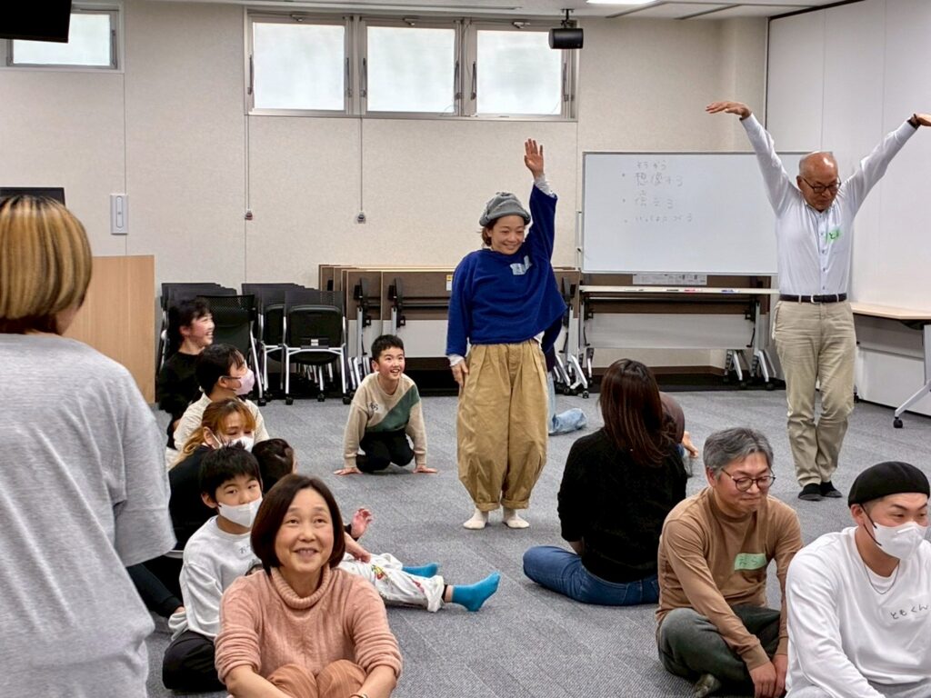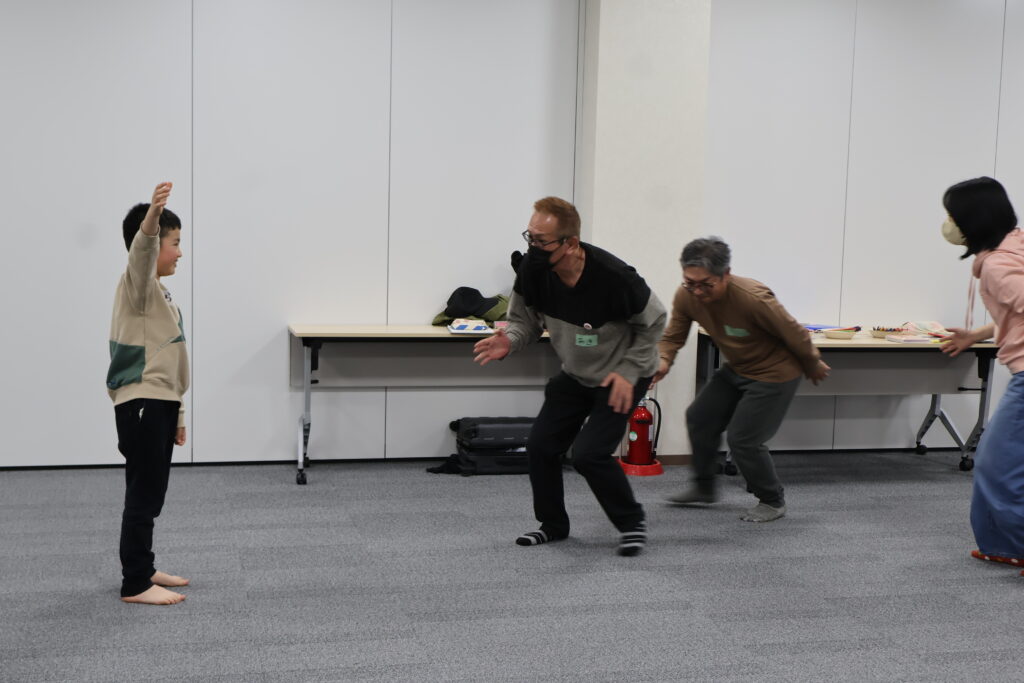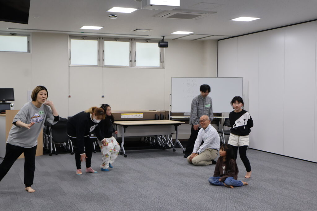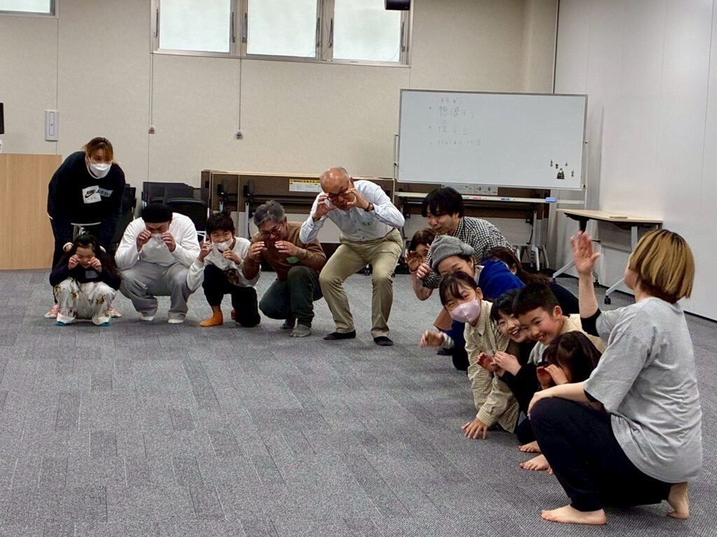 今回は、俳優の方がリードしながら体を動かして表現をするという内容で、正直よっしぃは「最近の子ども達、そういうの乗ってくれるかなぁ?」と心配していたのですが、今回担当して下さった俳優「阪本麻紀さん」の導入からの参加者を盛り上げる手法が秀逸でした。