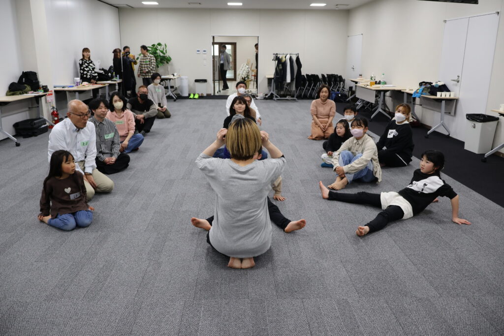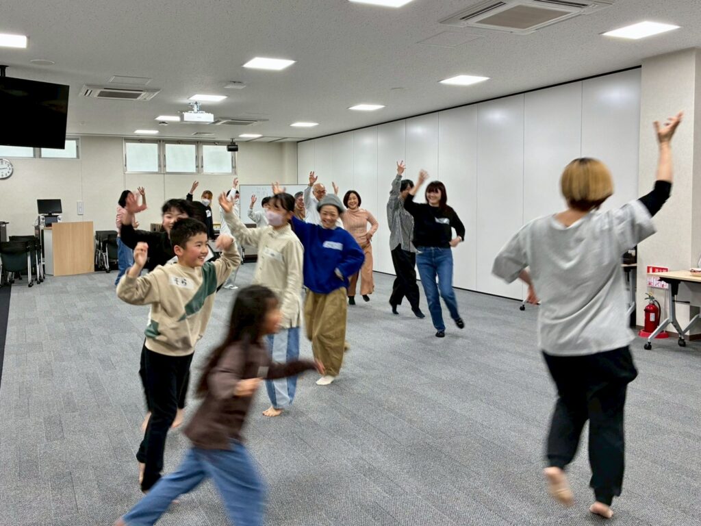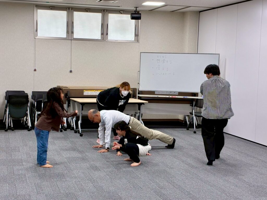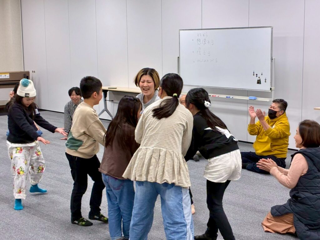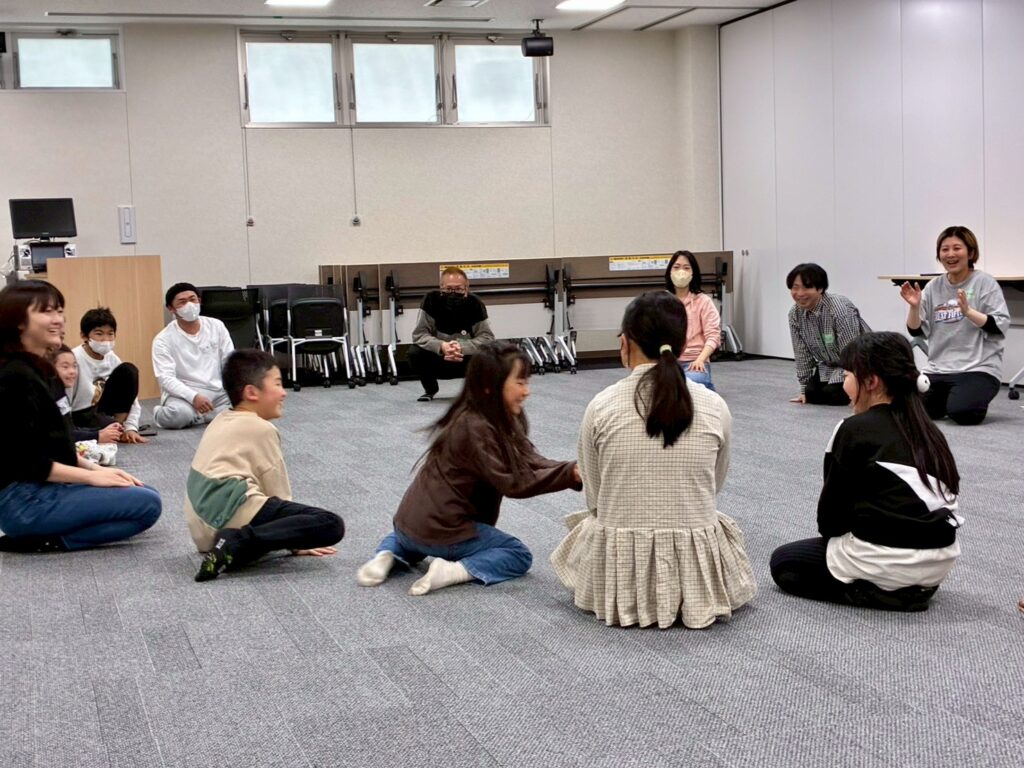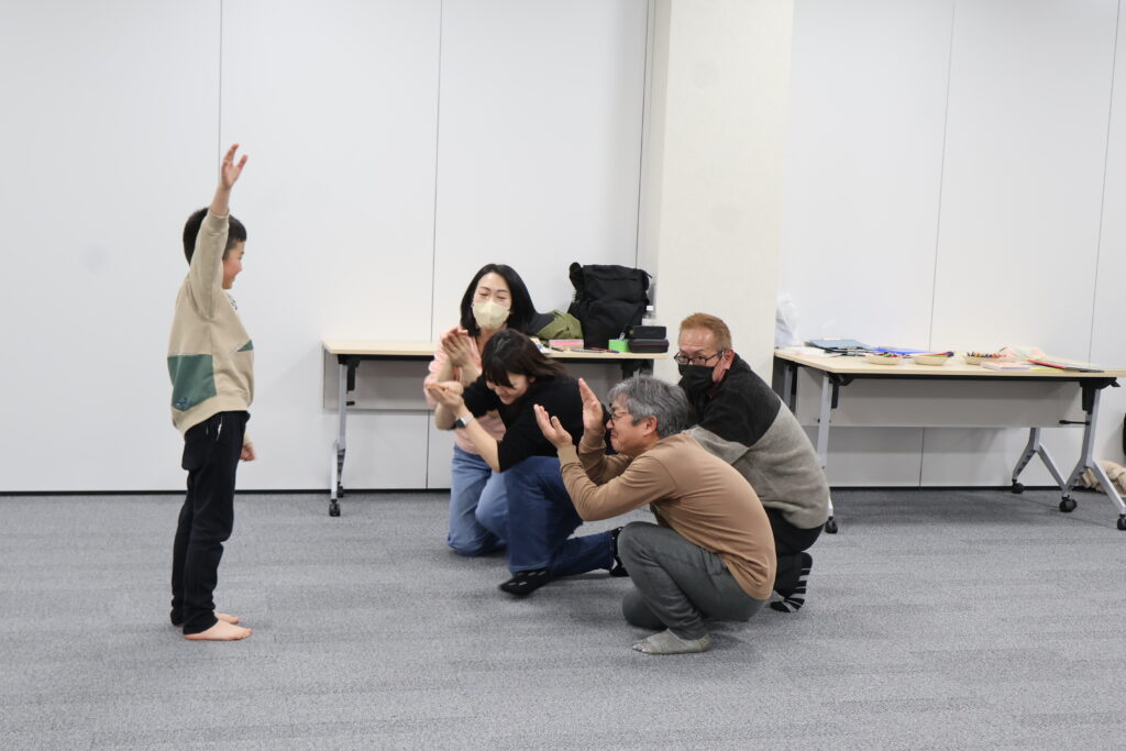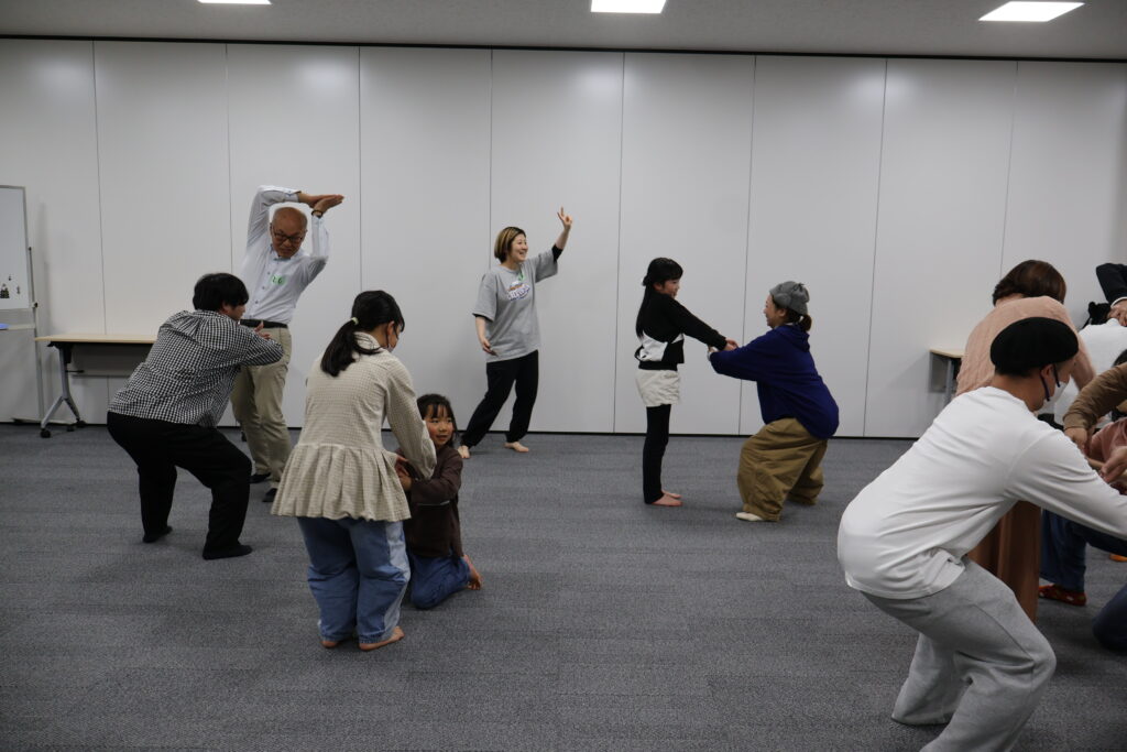 今回は、俳優の方がリードしながら体を動かして表現をするという内容で、正直よっしぃは「最近の子ども達、そういうの乗ってくれるかなぁ?」と心配していたのですが、今回担当して下さった俳優「阪本麻紀さん」の導入からの参加者を盛り上げる手法が秀逸でした。