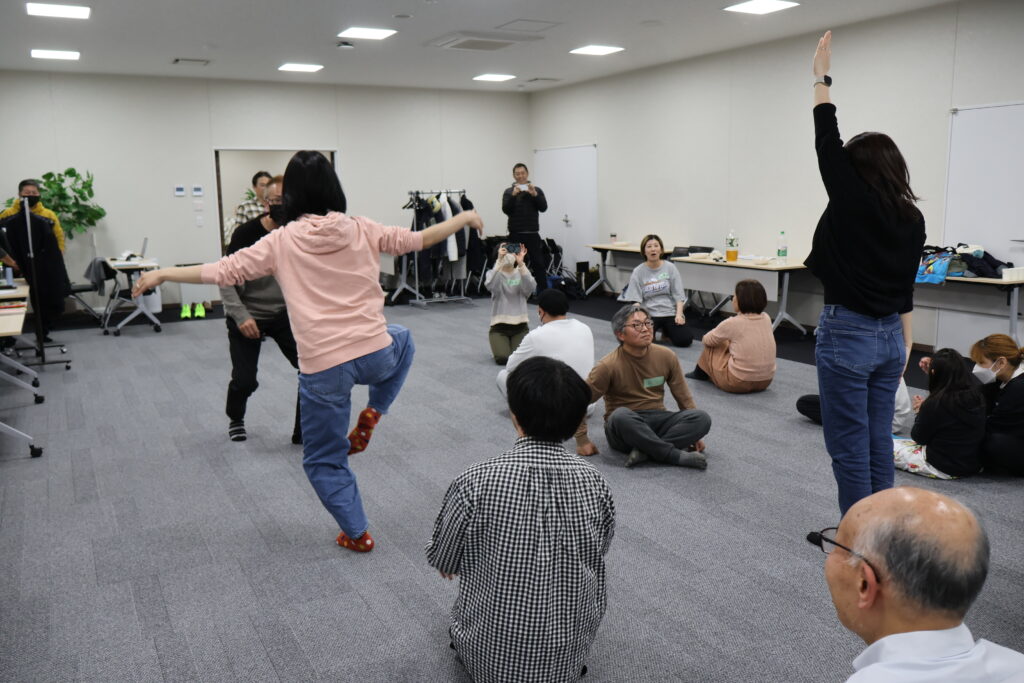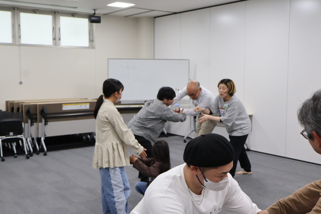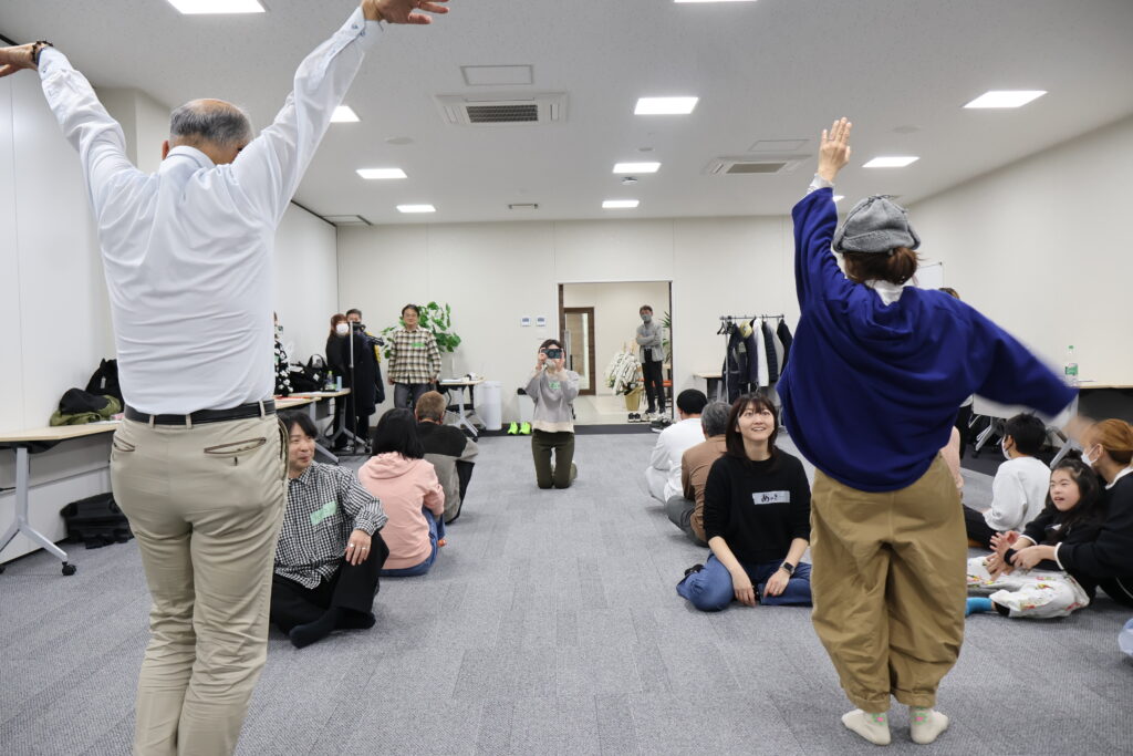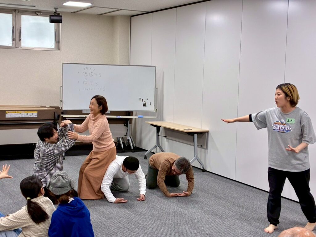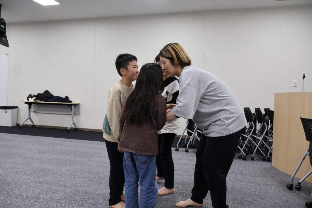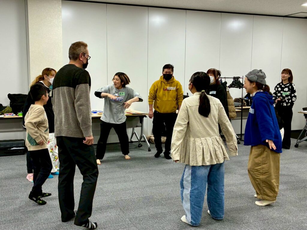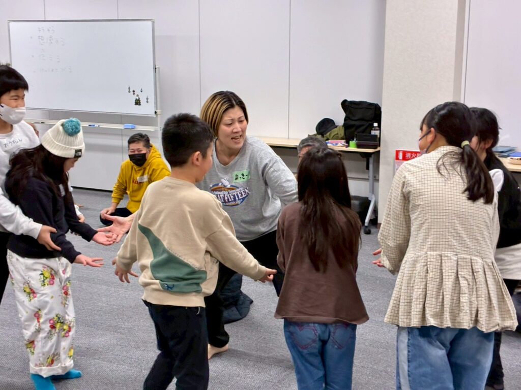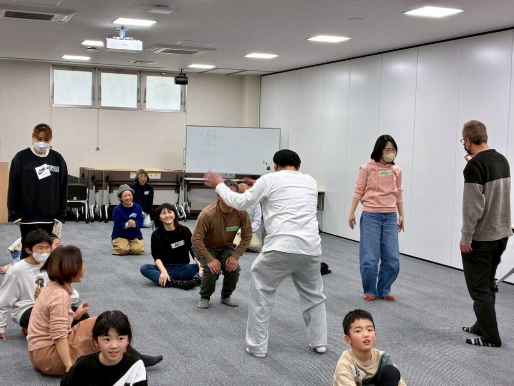 今回は、俳優の方がリードしながら体を動かして表現をするという内容で、正直よっしぃは「最近の子ども達、そういうの乗ってくれるかなぁ?」と心配していたのですが、今回担当して下さった俳優「阪本麻紀さん」の導入からの参加者を盛り上げる手法が秀逸でした。