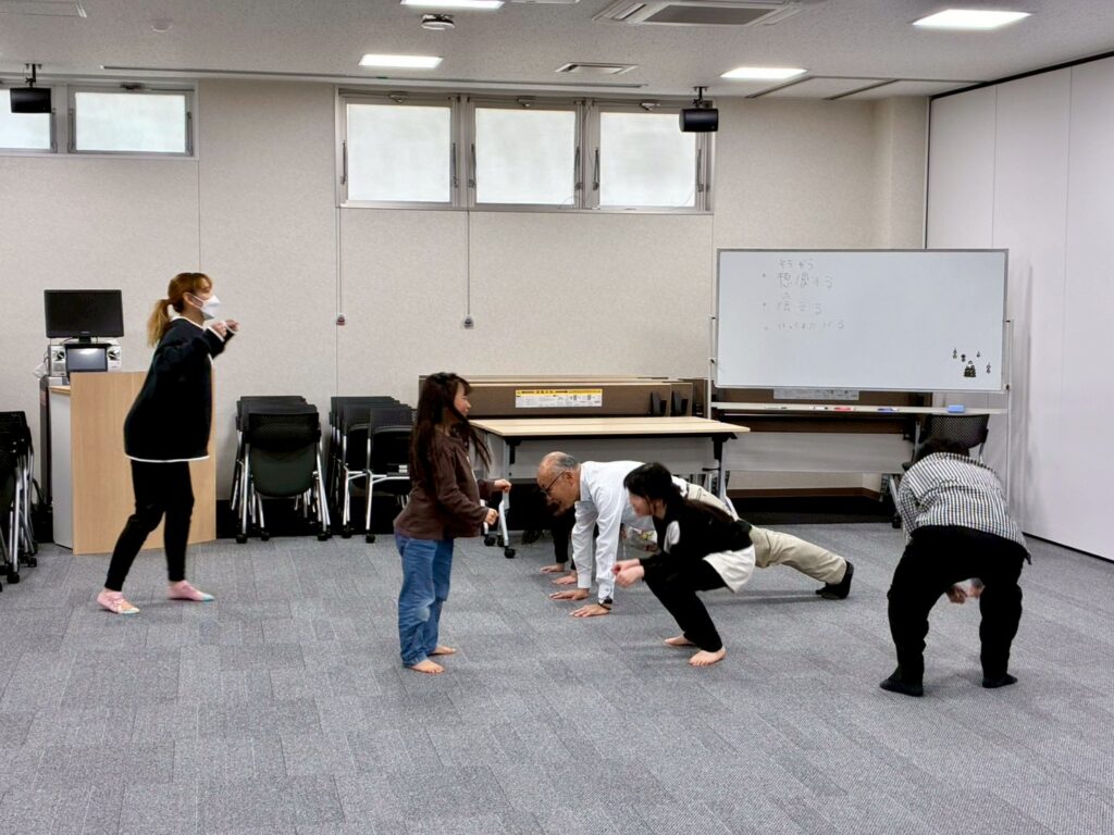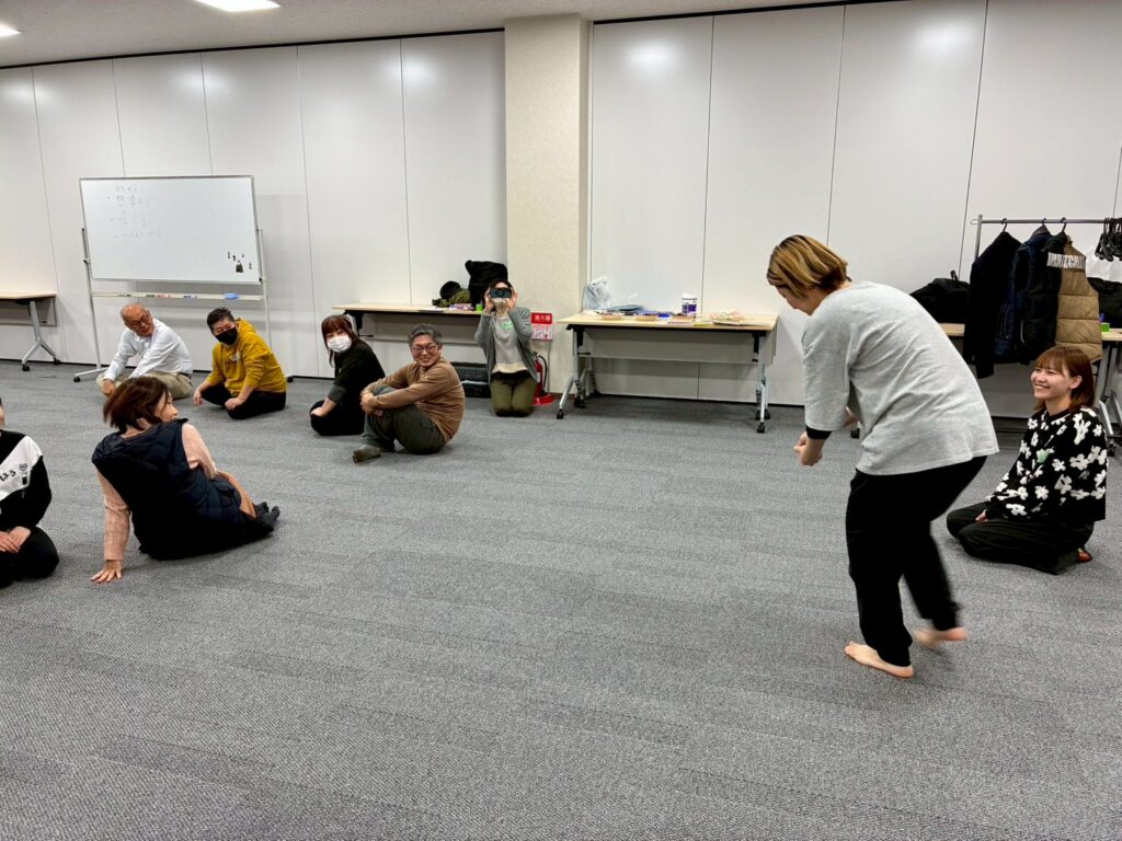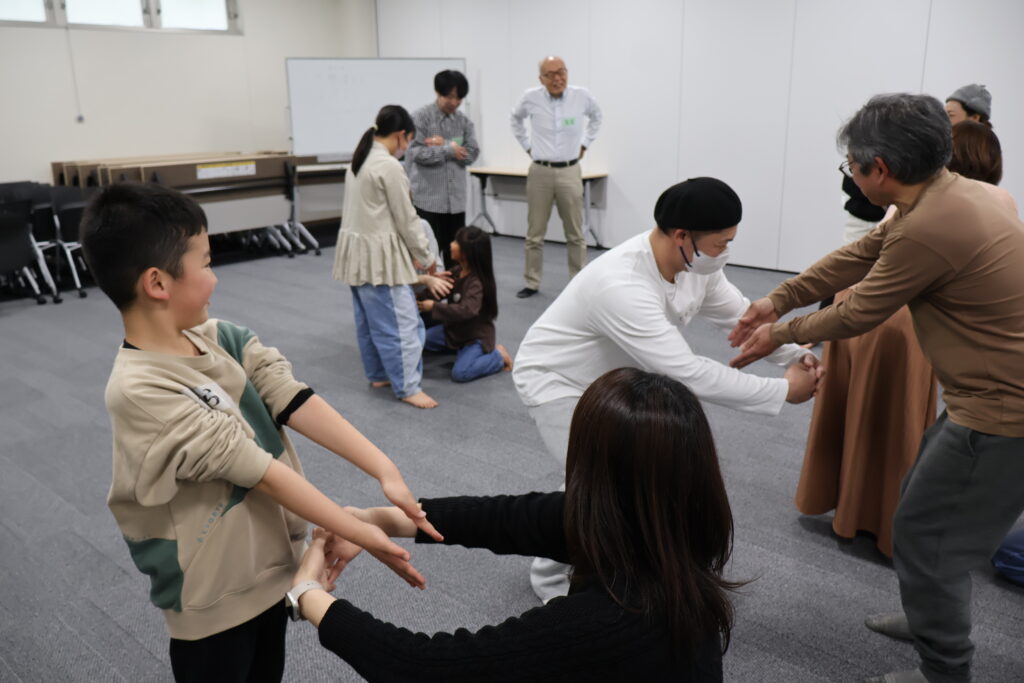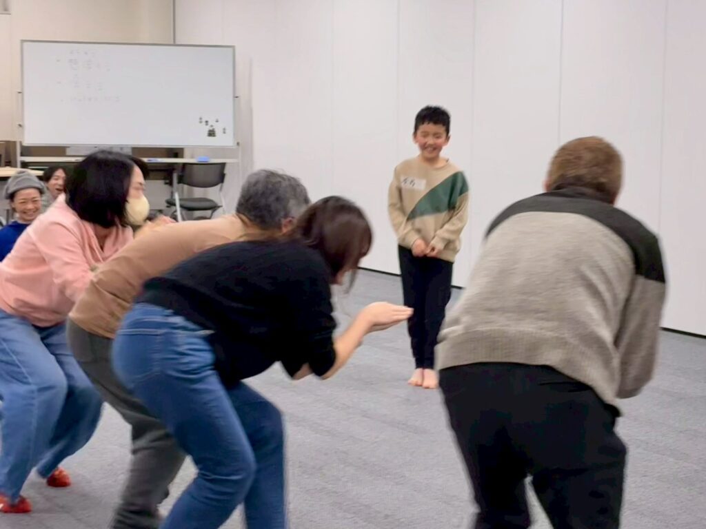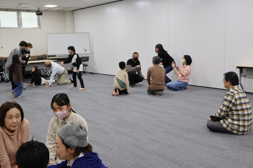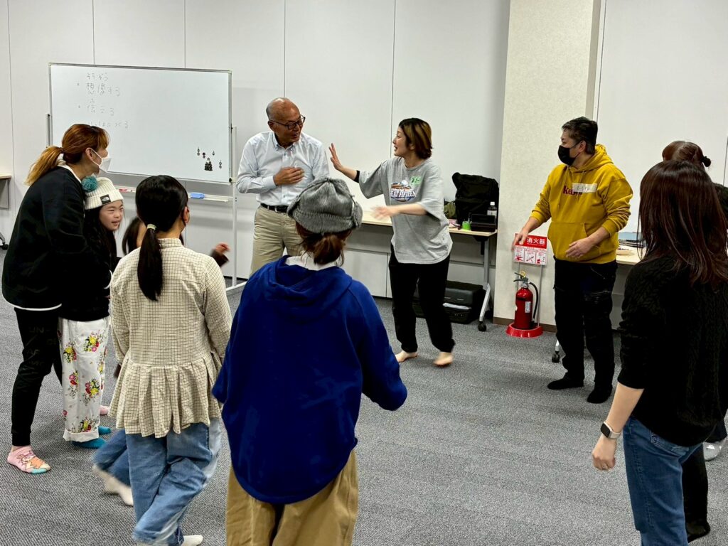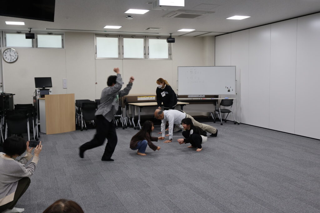 今回は、俳優の方がリードしながら体を動かして表現をするという内容で、正直よっしぃは「最近の子ども達、そういうの乗ってくれるかなぁ?」と心配していたのですが、今回担当して下さった俳優「阪本麻紀さん」の導入からの参加者を盛り上げる手法が秀逸でした。