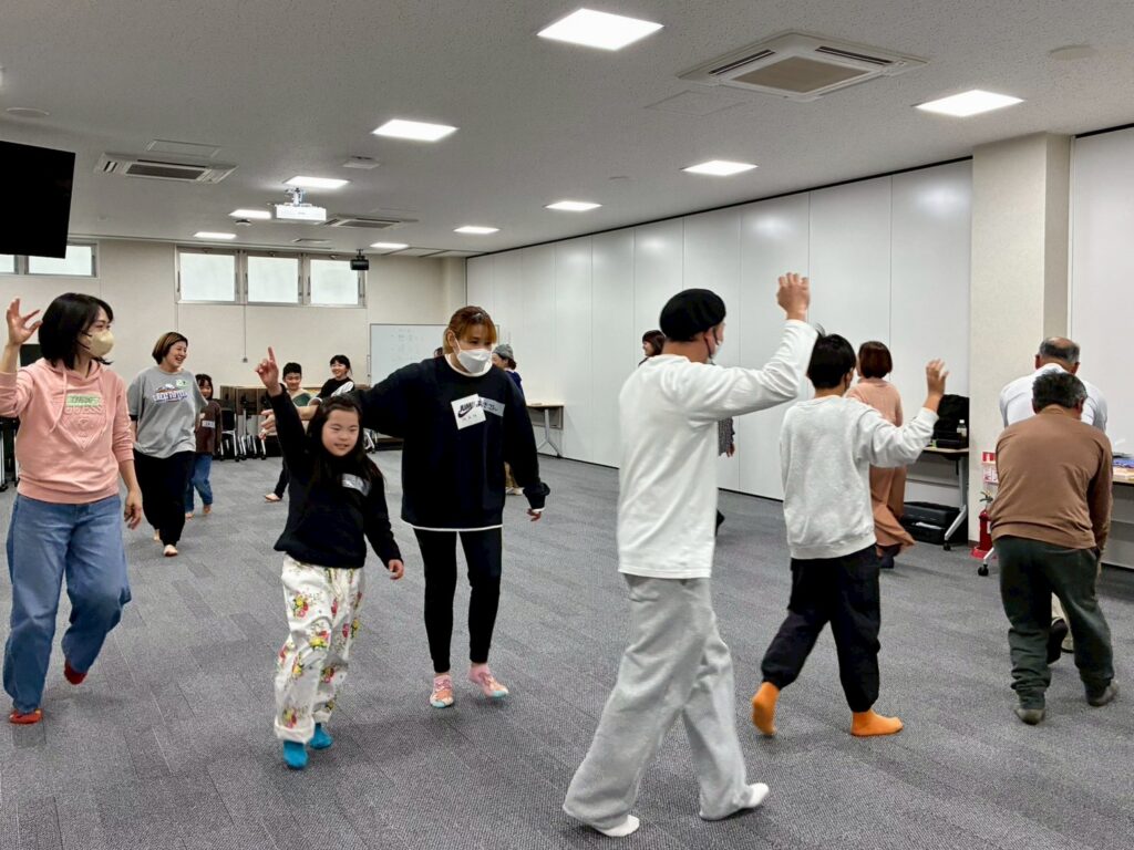 2週間前に実施した久留米でのイベントの際に、子ども達が溶け込み易いように、大人も全員参加者として小道具を身に付けダンスにも参加したところ、子ども達が抵抗なく参加出来たので、今回もコーディネーターの皆さんも参加者として一緒に体を動かして貰いました。