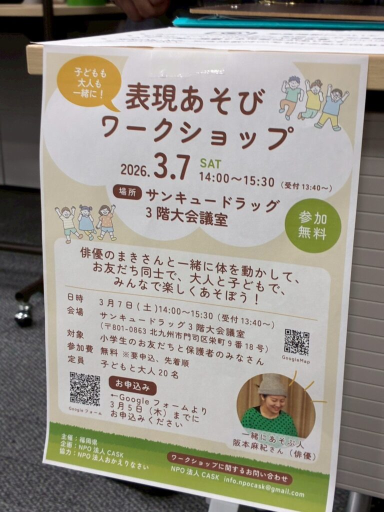 今回のイベントは、福岡県が主催し、企画・運営を福岡市のNPO法人CASKが行う「ふくおかこども食堂ワークショップコーディネーターOJTプログラム」のプログラムの一部です。