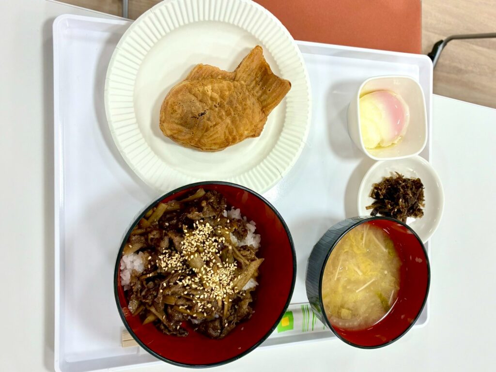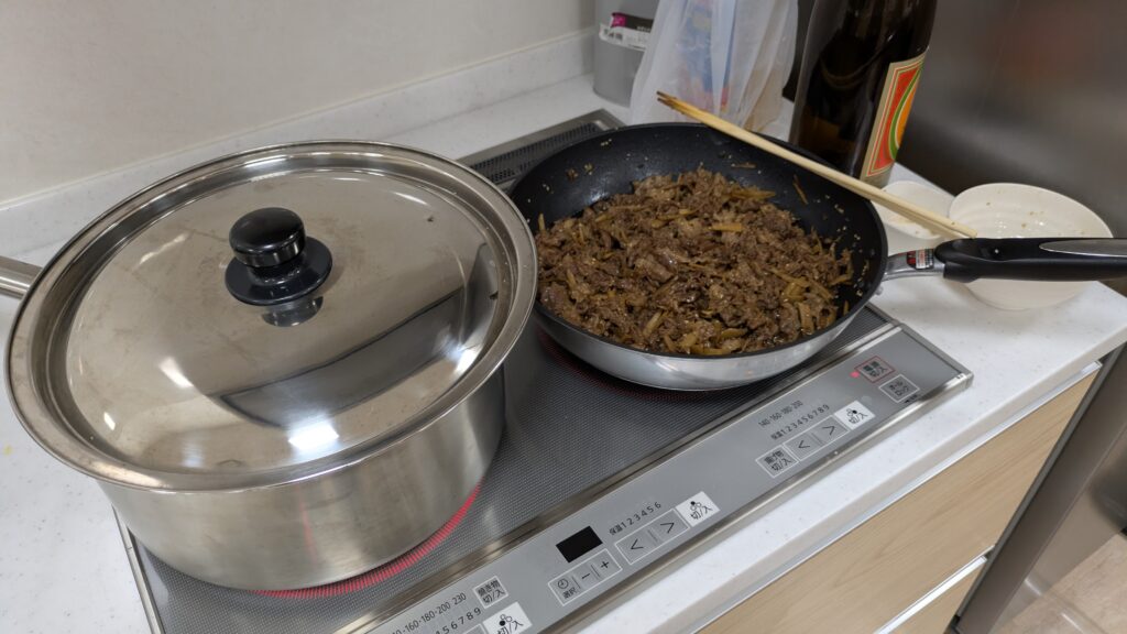 ・主食&主菜「牛ごぼう丼」「白米」(寄付のパックご飯をレンジ調理した上で電子ジャーで保温)